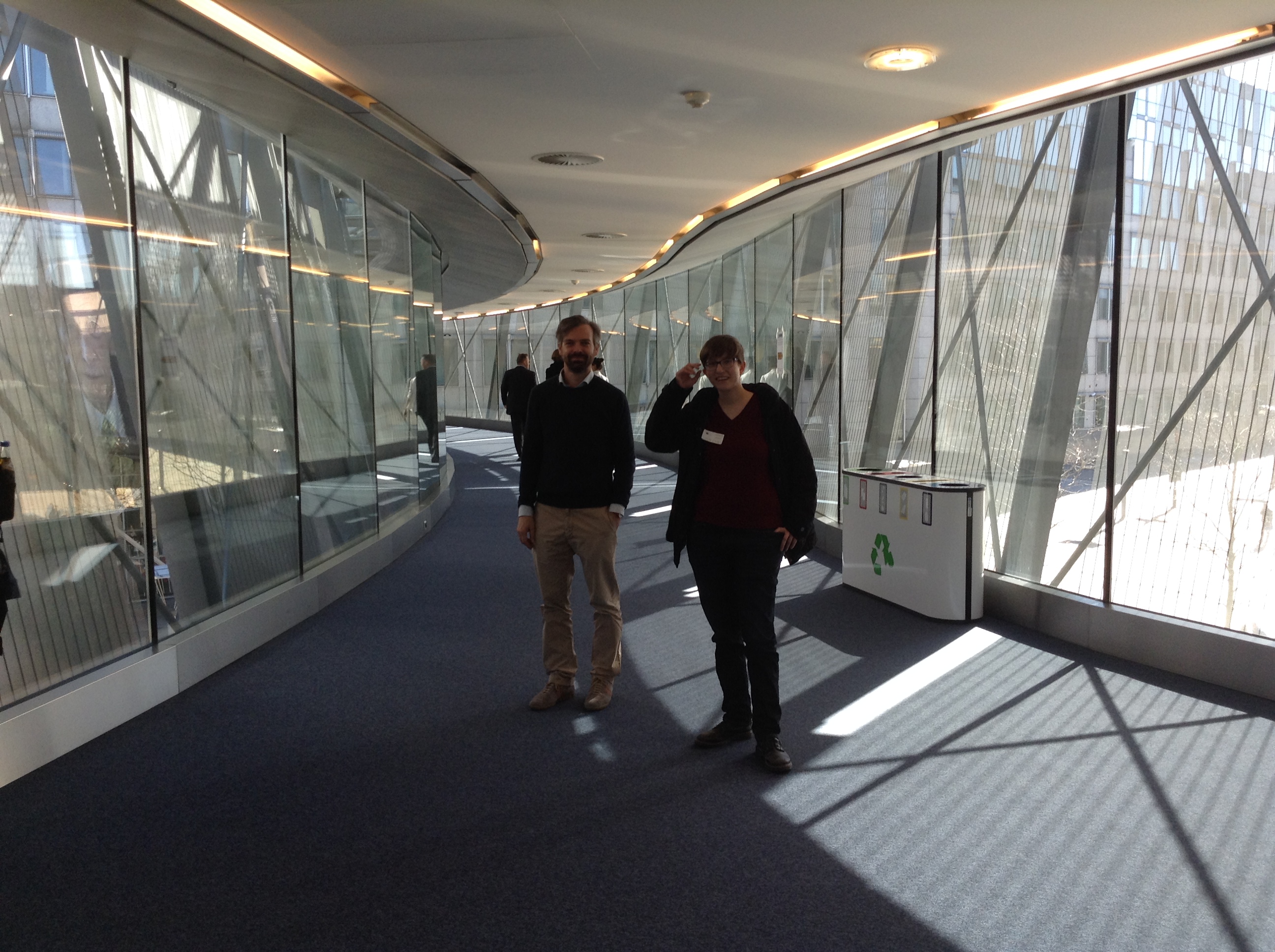 Published 24. März 2014 at 2592 × 1936 in Julia Reda, Piratenpartei Deutschland, mit Martin Ehrenhause in den Glasbrückengängen des EU Parlamentes